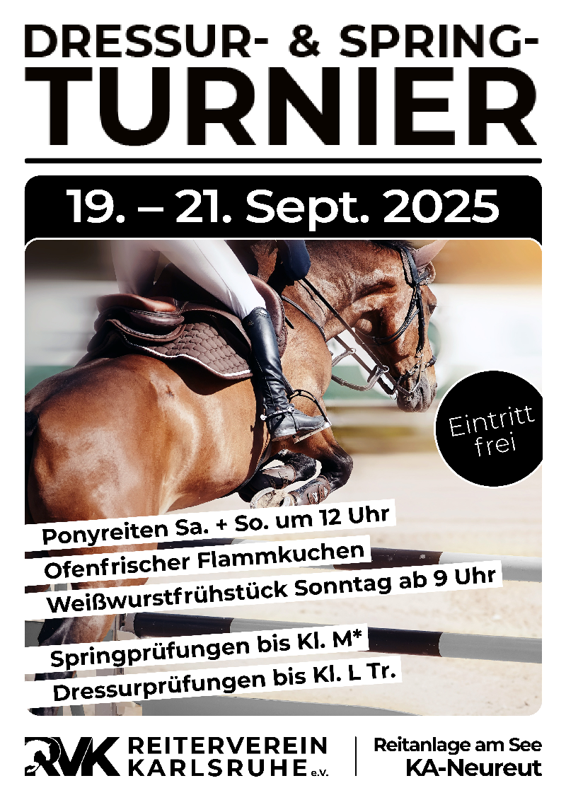 Der Reiterverein Karlsruhe e.V. veranstaltet das Reitturnier auf seiner Reitanlage am See. Hierzu haben sich wieder zahlreiche Teilnehmer angemeldet. Sie starten in verschiedenen Dressur- und Spring-Prüfungen bis zur Klasse M. Wir freuen uns, Sie als Gäste auf unserer Anlage begrüßen zu dürfen und Ihnen ein interessantes Sportwochenende bieten zu können. Für das leibliche Wohl ist […]